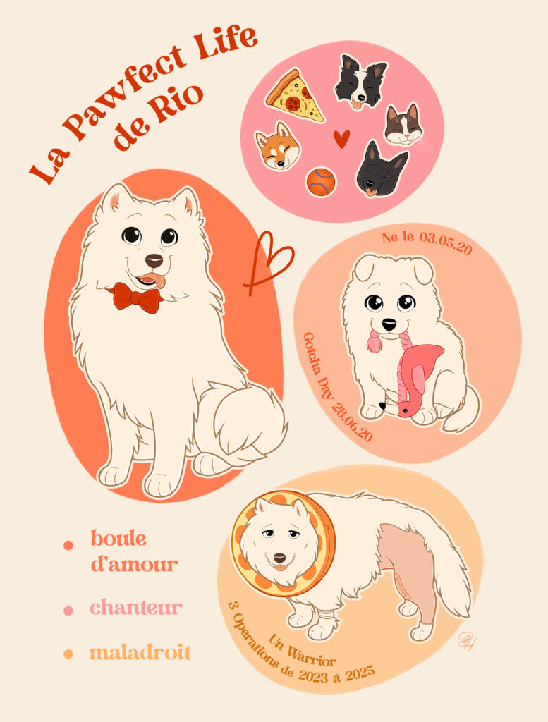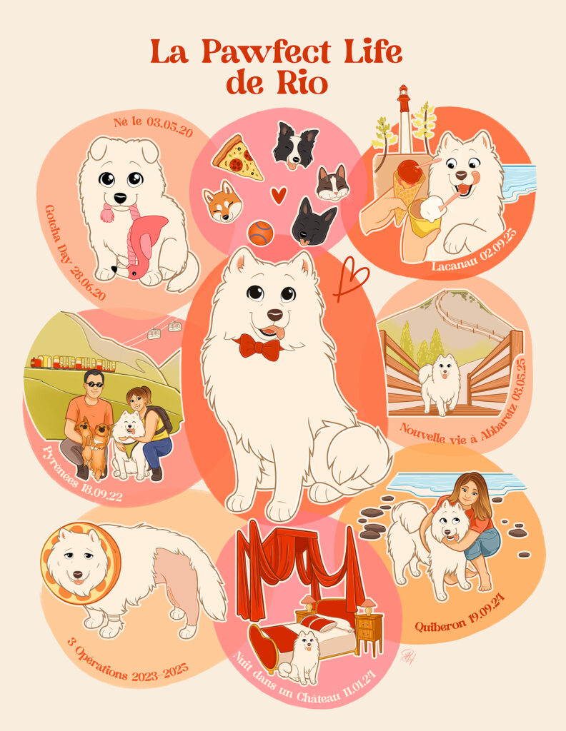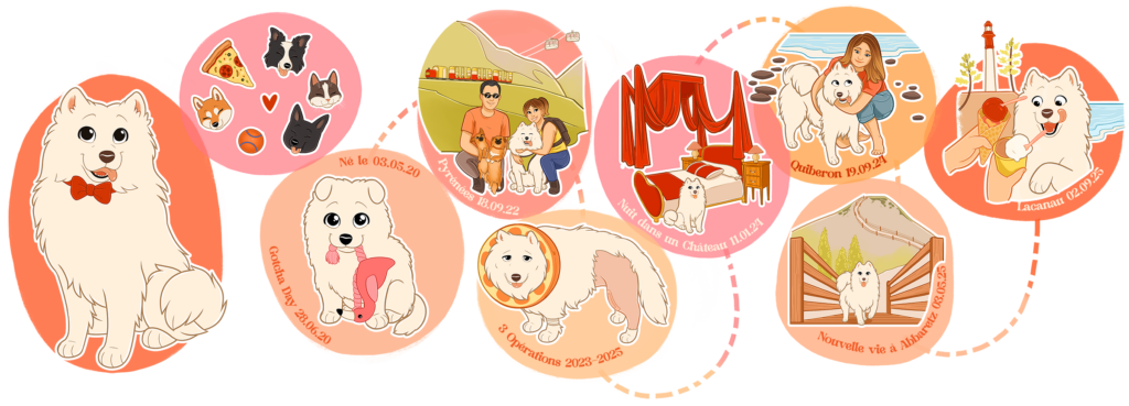- Une frise chronologique de la vie de votre animal, illustrée sous forme de bulles.